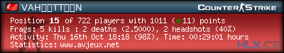 1 | -=AvJeux # gungame=- | 5 | 100.00% | 2 | 2.5000 | 2 | 100.00% | 0.4000 |
